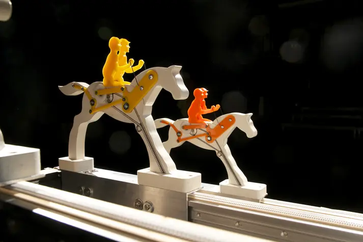 在吉森大学的应用戏剧研究学会,有一个学生项目是重建德国民族传统游戏“肯塔基赛马”。在这个技巧游戏中,玩家要能够熟练操控比赛球来促使其机械马前往终点。与原型不同的是,新版本中的玩家不直接与游戏过程进行互动。相反,参赛者都坐在另外一个由摄像头监控的房间里面。玩家的热情越高,越能激励他的马快速跑向终点。例如,通过叫嚷或拍手,叫的越响、拍的越快,马跑的越快。这些马由 Nanotec 提供的步进电机 PD4-N6018L4204 驱动。这些电机由相同的软件(光线和声音)控制,实现了机械元件和视听媒体的完美结合。