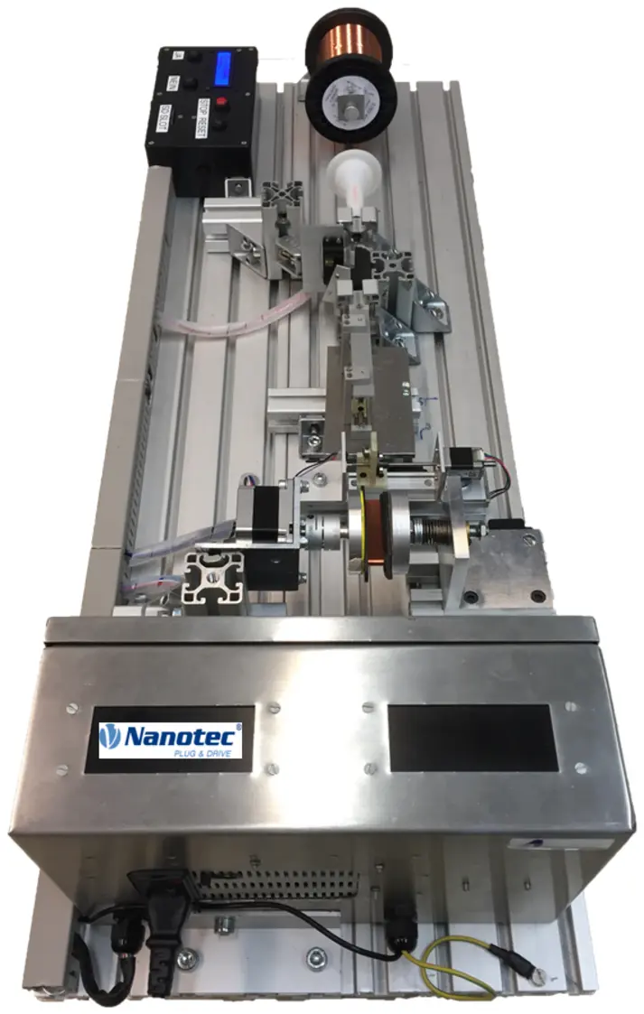 慕尼黑应用科技大学机械电子和精密工程专业的学生为吉他拾音器开发了一台自动绕线机,并在 2016 年夏季学期的“机电一体化”研讨会中亮相。他们开发了一种特殊的弹簧系统,使得漆包线在拾音器线轴上缠绕时不会卡住。为了驱动拾音器的旋转,他们采用了步进电机 ST5918。在 SMCI35 控制器的帮助下,可以在绕线数增加时让驱动电机的速度逐渐增加到某个阈值。然后电机以恒定速度旋转,直到绕线完成。此外,通过外部线性执行器 LS20,使得线材平行于拾音器旋转轴在线轴的整个宽度上连续馈送。