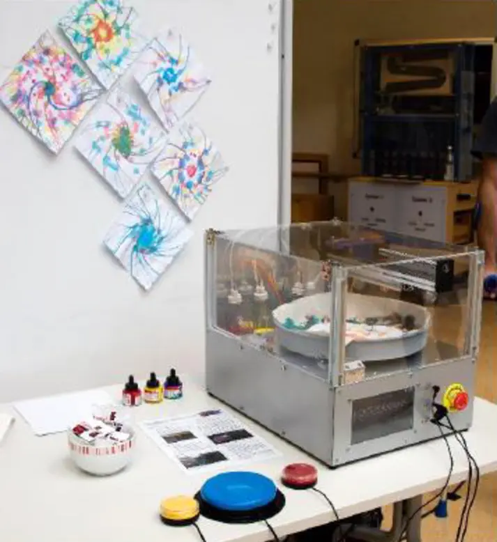 一个由来自奥格斯堡大学的六名学生组成的团队,设计并制造了一款可以为“Fritz-Felsenstein 之家”绘制彩色图案的机器。这个地方是残障人士的家。“涂料弹射器” 项目采用了 Nanotec 的ST8918M6708-B 高转矩步进电机,用于驱动旋转盘。学生们在盘上安装了一块纸板,涂料通过线性输送装置和泵机元件滴落到盘上。旋转力将涂料滴液导向外侧,从而根据速度和施力位置,生成独特的图案。在设备启动后,可通过触摸显示屏设置速度。屏幕上的三个按钮用于选择颜色、主轴位置以及涂覆涂料,让设备操作轻松方便。来源和照片:Patrick Lebmeier