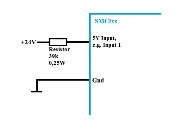 对 SMCI 系列仅应用 24V 至 5V 数字输入 电机控制器/驱动器 配置示例 带控制器的电机 配置示例 控制器 SMCI12、 SMCI36 和 SCMP33 具有 5 V 输入。如果要应用 24 V 控制信号,则必须在使用中的每个输入端串联一个 39 kOhm (0.25 W) 的电阻。