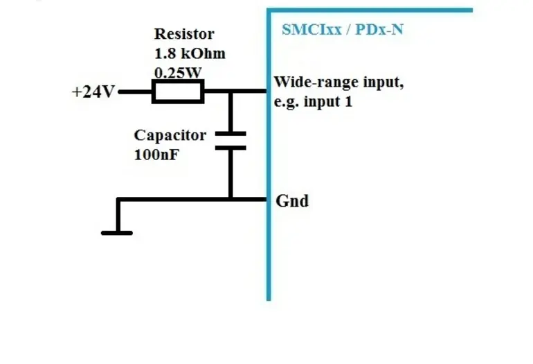 用于 24V 控制信号过耦合的防干扰电路 电机控制器/驱动器 故障排除 带控制器的电机 故障排除 根据电缆类型、布线和长度的不同,24-V 控制信号可能会过耦合到相邻的控制线路。在具有宽范围输入 (5–24V) 的电机控制器中,这可能会导致第二个未激活的输入端被识别为高电位。为了防止这种情况而不改变布线(可能是一个相关过程),可以为使用的每个输入端提供以下抑制电路。不需要的输入端可以直接连接到电机控制器接地线。