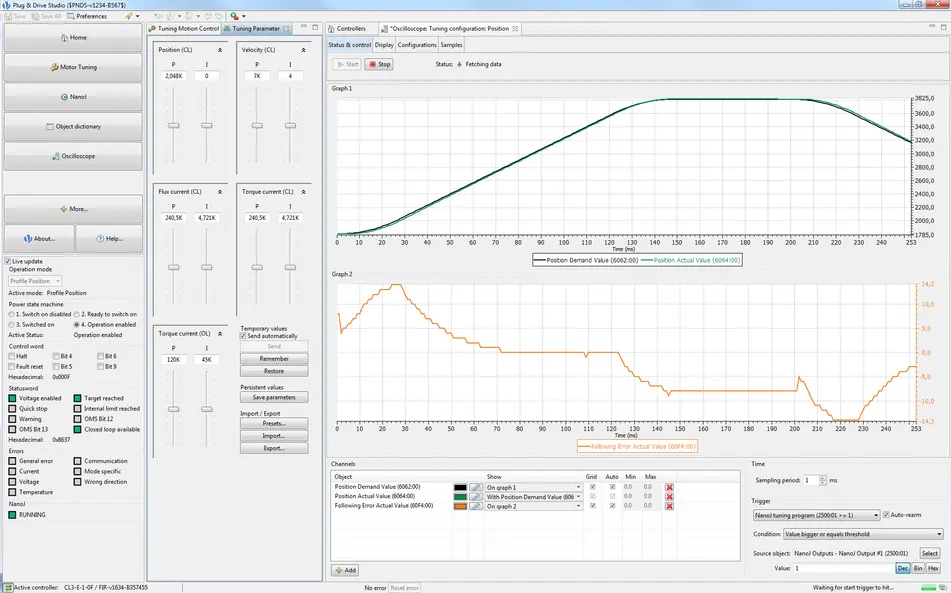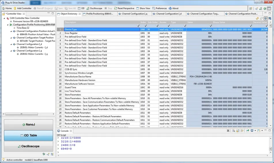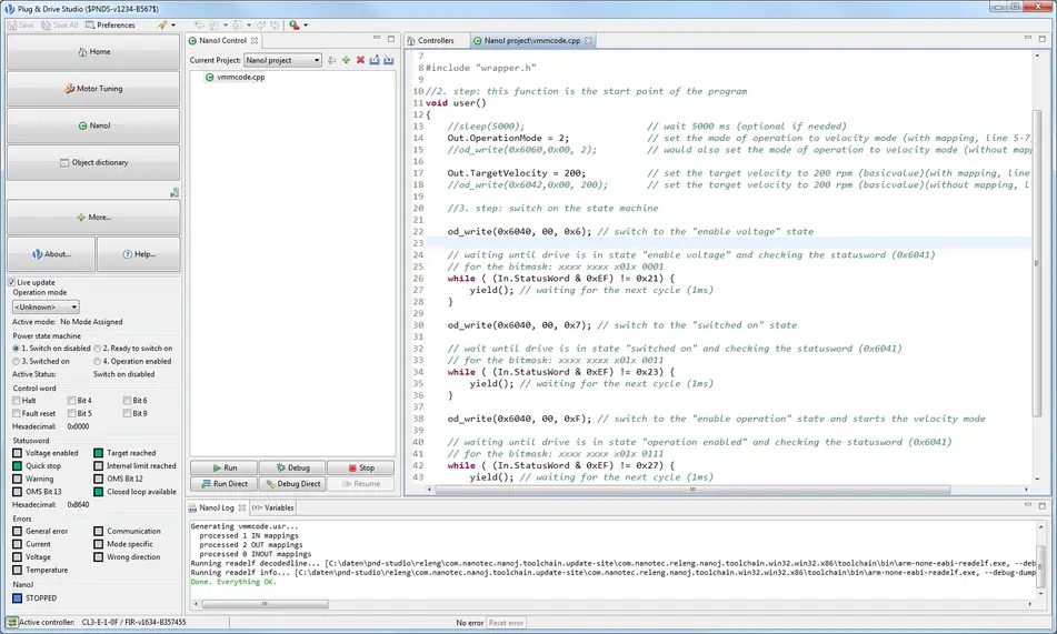 Plug & Drive Studio 带控制器的电机 基本知识 在设置和为电机控制器编写程序方面,Nanotec 提供免费的 Plug & Drive Studio 软件。由于具有多种操作模式,设置变得异常简单。用户可以使用选项卡进行模式的选择和配置。直观的菜单导航将用户所需的条目数量减少到仅几个参数,从而缩短了设置时间。同时,可以通过对象目录配置控制器预定义的过滤器可用于显示特定于某一给定任务的完整 CiA 402 对象的一部分。 对象字典 可简化 Nanotec 电机控制器的设置和编程的新软件现已推出:Plug & Drive Studio。可以通过各种现场总线 (CANopen、Ethernet、Modbus) 从电脑访问该控制器。在设置时,可以通过表来读取和写入保存有控制器配置的对象目录。预定义的过滤器使得用户能够显示与特定任务相关的 CiA 402 对象部分,例如设置或特定的工作模式,即速度。有经验的用户可以通过集成的命令行来配置对象。可以对整个通信进行记录并在稍后回放,这样在设置过程中只需输入一次冗长的命令序列。为了调整控制器参数,集成的示波器可以以高达一毫秒的分辨率同时显示八个对象。记录可以通过自由配置的启动和停止触发器来控制,这些触发器为显示的对象定义条件,例如达到某个位置或激活数字输入。包含所需对象(例如跟随误差、目标位置和实际位置)的示波器设置是为标准优化而预定义的。这些设置可以随时调整。 示波器以及目标和实际位置与跟随误差 为了使用 NanoJ V2 对控制器进行编程,我们提供了一个集成的开发环境,该开发环境由一个带有自动代码填写功能的源文本编辑器、一个编译器和一个调试器组成。调试器允许程序员在程序中设置四个可以读出变量值的断点。由于所有 Plug & Drive Studio 功能都可以同时使用,因此可以在程序执行过程中使用对象目录和示波器来检查控制器行为。因此,可以轻松快速地编写用户专用的功能。 编程编辑器