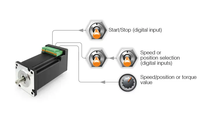 具有集成控制器的 Nanotec 控制器,可通过四种不同方法进行控制。通过 DIP 开关、配置文件或软件,用户可以选择一种方法。支持的控制类型相关信息可参见产品数据表。