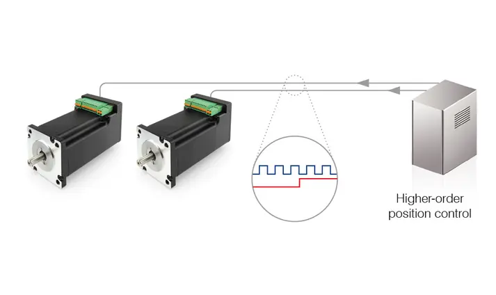在脉冲方向模式下,电机可通过高级定位控制器的数字输入,借助脉冲和方向信号进行操作。每次收到脉冲信号时,电机都会向方向信号的方向移动一步。Nanotec 控制器采用基于软件的控制方式,可实现脉冲信号和位置之间灵活的相互作用。由于输入脉冲始终在背景位置进行插补,因此获得电机所需的正弦变换,无需采用微步进。这意味着,仅输出整步或半步的更早、更高级的控制器,页将从微步进静音运行的特点中获益。每转的步数也可定义为一个合理的数字(分子/分母)。通过对实际步角或电机电极数进行去耦,也能够轻松地在现有应用中更换电机类型,例如将三相步进装置更换为直流无刷电机,且无需更改循环次数。除了常规的以输入决定方向的脉冲方向模式外,还可以采用向右/向左旋转模式 (CW/CCW) 。