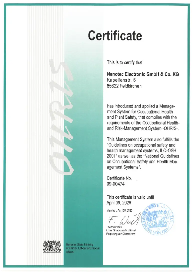 位于德国费尔德基兴的Nanotec Electronic GmbH & Co. KG,凭借其在职业安全方面的良好表现,获得了OHRIS证书。这是公司第四次获得巴伐利亚州政府颁发的奖项。 在审核过程中,涉及到了各种因素,包括职业安全和工厂安全理念、员工培训措施、风险评估等等。经过慕尼黑贸易监督办公室确认,Nanotec 在这些方面都符合 OHRIS 的要求。 Nanotec通过自愿参与OHRIS计划,为其约 150 名一线员工提供了最高安全标准的工作环境,并保证了高质量产品的可持续化生产。公司的可持续环境管理对当地社区也产生了积极的影响。 关于 OHRIS OHRIS(职业健康与风险管理系统)是巴伐利亚州推出的一个职业和工厂安全管理体系。是由巴伐利亚贸易监管局和行业代表共同制定,旨在保护员工免受工作相关危害,并对技术系统的安全性进行记录。该认证为自愿性认证,自颁发之日起三年有效期。