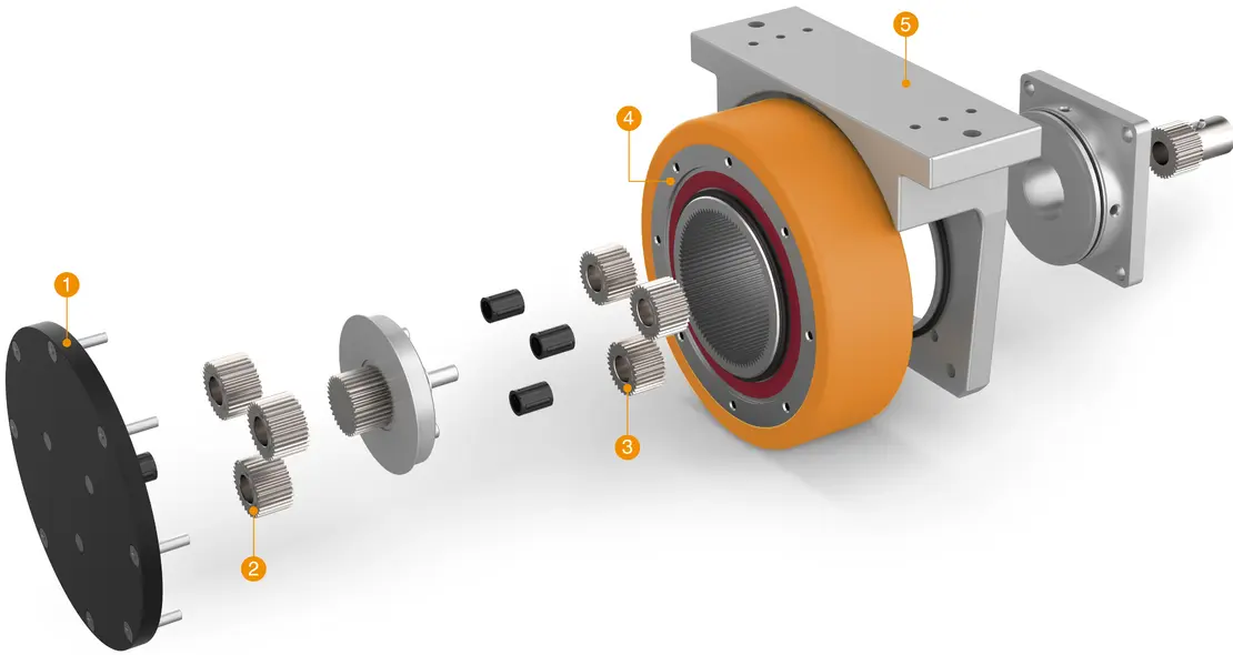 1 二级行星架 | 2 第二行星级 | 3 第一行星级 | 4 齿圈、球轴承和轮 | 5 安装架