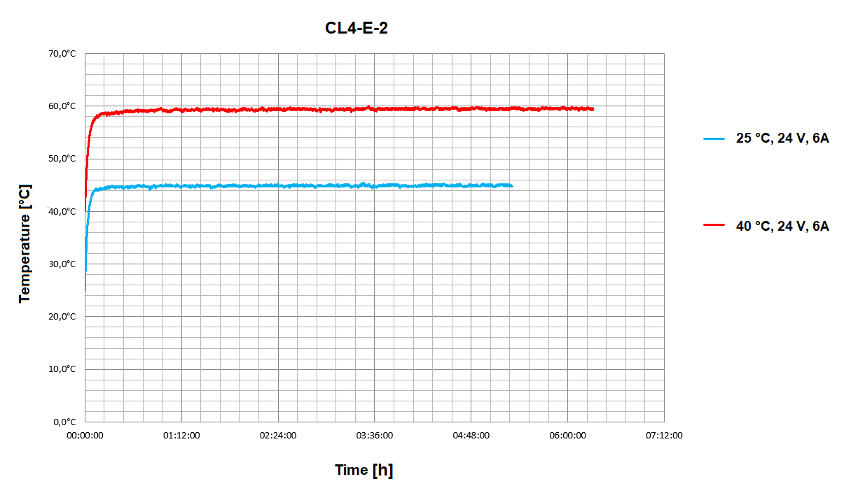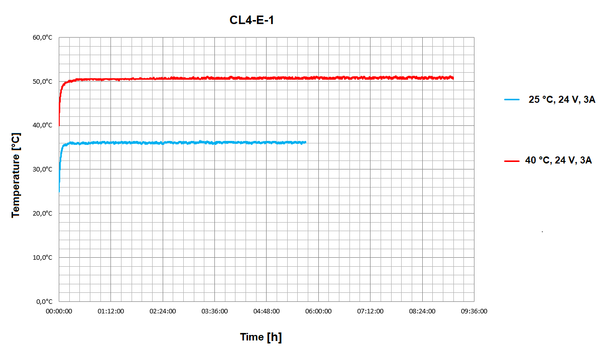 Overtemperature protection Above a temperature of approx. 75°C on the power board the power part of the controller switches off and the error bit is set (see objects 1001h and 1003h). After cooling down and confirming the error (see table for the controlword, "Fault reset"), the controller again functions normally. The following temperature test results provide information on the temperature behavior of this controller. Temperature tests are performed under the following conditions: Operating voltage: 24 V DC Motor current: 3 A (CL4-E-1-xx low current)/6 A (CL4-E-2-xx high current) rms Operation mode: Velocity Mode, full step, 30 rpm Ambient temperature: 25 °C / 45 °C Altitude of site: 500 m above sea level No external cooling in the climatic chamber, e. g., via fan The following graphics show the results of the temperature tests: Note: Aside from the motor, the exact temperature behavior is also dependent on the flange connection and the heat transfer there as well as on the convection in the application. For this reason, we recommend always performing an endurance test in the actual environment for applications in which current level and ambient temperature pose a problem.