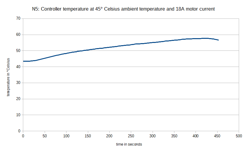 At 45°C (+48 V, 18 A rms, Velocity Mode 30 rpm), temperature protection switched off the N5-2-x in less than 8 minutes.