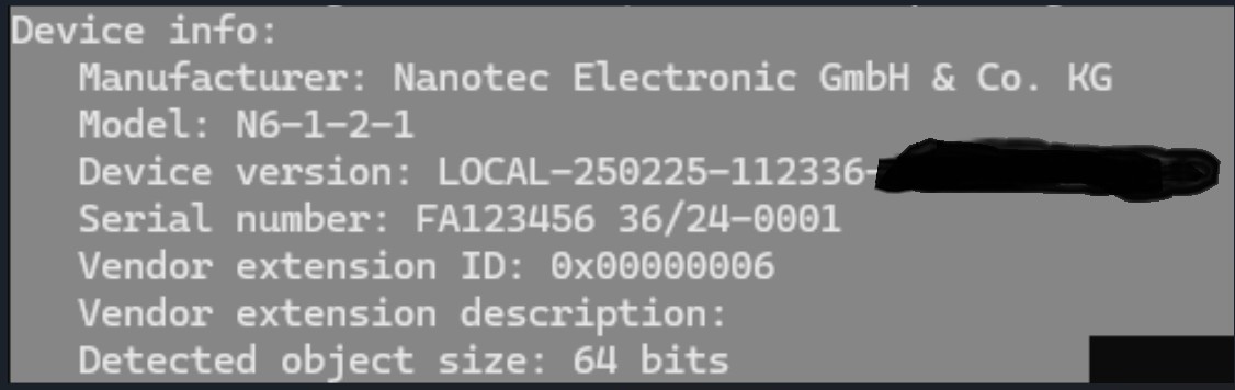 USB connection Notice image/svg+xml Damage to the product and/or external hardware caused by differences in potential at the USB. Connecting the USB cable while the electronics are being supplied (hot plugging) may result in damage. ► Connect USB before switching on the supply voltage. ► If possible, equalize differences in potential between PC and product or use USB isolator. ► First connect the USB cable to the product, then to the PC. If the controller is connected to a PC via a USB cable, an MTP device that contains a data carrier is created in the Windows file explorer. Up to three files are displayed, the configuration file (cfg*.txt), the firmware (*.fw) and the NanoJ program (nanoj*.usr), which is stored internally immediately after restarting the controller and is no longer displayed. You can thereby store the configuration file or the NanoJ program on the controller. The voltage supply of the controller must also be connected during USB operation. Note: Only use a standard Micro USB cable, . Never use a USB cable that manufacturers of mobile phones include with their products. These USB cables could have a different plug shape or pin assignment. Do not save any files on the controller other than those listed below: cfg*.txt nanoj*.usr reset.txt Other files are not accepted by the controller. PowerShell scripts In the download area of the product website at nanotec.com, you can find file mtp.ps1 with examples for the Windows PowerShell console. You can use this to: List all stored files:.\mtp.ps1 -Action list -DeviceName N6-1-1-1 Copy a file from the current script folder to the device:.\mtp.ps1 -Action copy -DeviceName N6-1-1-1 -FileName cfg_Example.txt Delete a file:.\mtp.ps1 -Action delete -DeviceName N6-1-1-1 -FileName cfg_Example.txt MTP in LinuxNanotec recommends the following: MTP Tools. If the GVfs often included in Linux distributions is already installed, uninstall it first:sudo apt remove gvfsThen install MPT Tools and libmtp and restart: sudo apt-get install mtp-tools sudo apt-get install libmtp-runtime reboot After connecting the USB, check whether the device is detected:mtp-detectThe device responds to this with its properties (manufacturer, product name, serial number, etc.), similar to the following figure.You can now: List all stored files with their ID:mtp-files Copy a file from the current script folder to the device (the name must be identical):mtp-sendfile cfg_Out.txt cfg_Out.txt Copy a file from the device (file ID listed as with mtp-files):mtp-getfile 1072922872 cfg_Or.txt Delete a file:mtp-delfile -f cfg_Example.txt