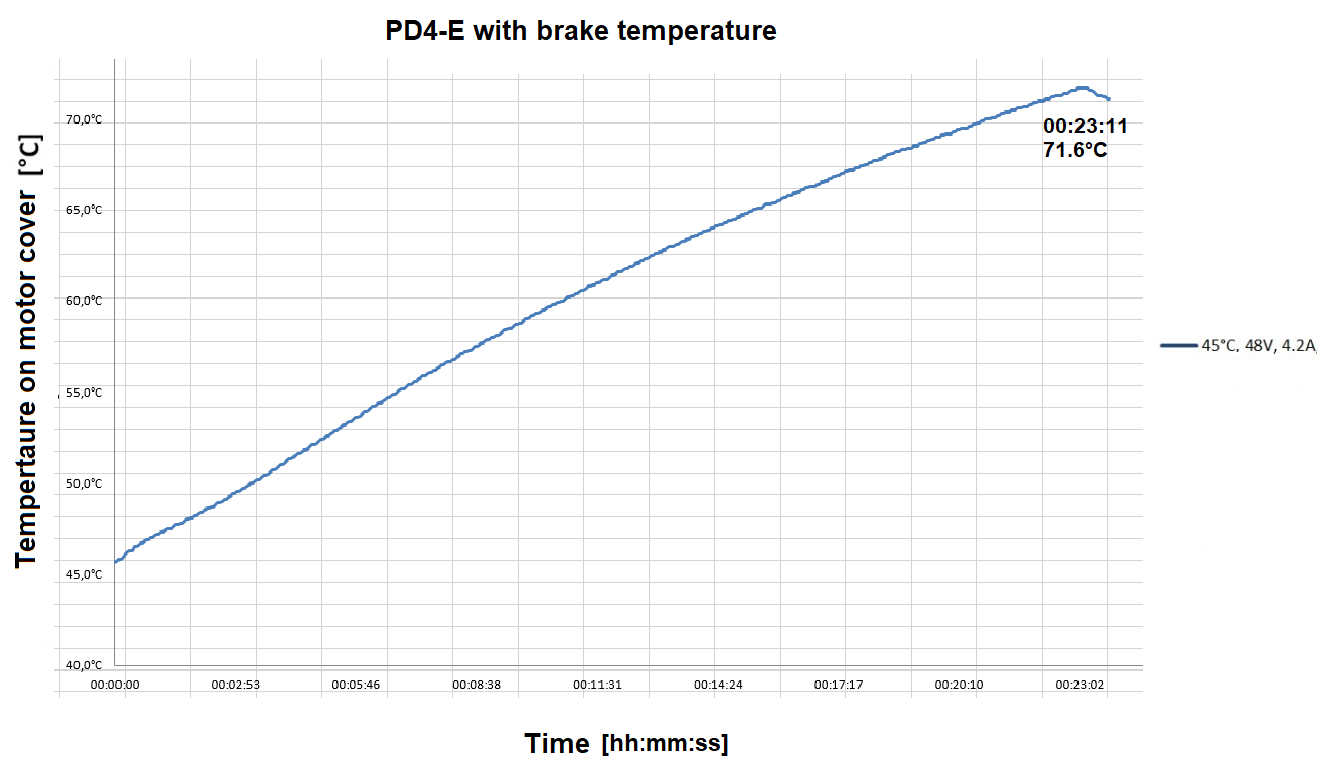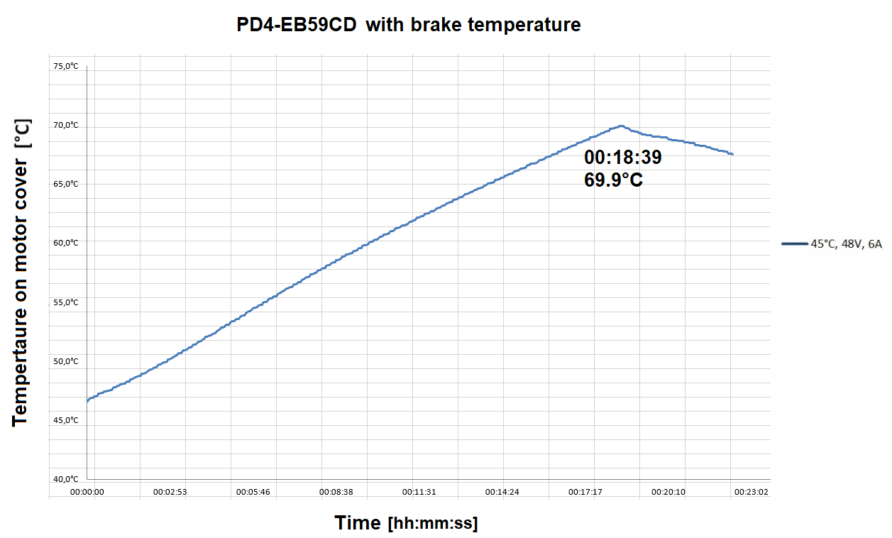 Overtemperature protection Above a temperature of approx. 75°C on the power board (corresponds to 65–72°C outside on the back cover), the power part of the controller switches off and the error bit is set (see objects 1001h and 1003h). After cooling down and confirming the error (see table for the controlword, "Fault reset"), the controller again functions normally. The following temperature test results provide information on the temperature behavior of this controller. Temperature tests are performed under the following conditions: Operating voltage: 48 V DC Motor current: 4.2 A (stepper motor) / 6 A (BLDC motor) rms Operation mode: Velocity Mode, full step, 30 rpm Ambient temperature: 25 °C / 45 °C Altitude of site: 500 m above sea level No external cooling in the climatic chamber, e. g., via fan Motor not flanged mounted The following graphics show the results of the temperature tests: Summary: At 25°C (+48 V, 4.2/6 A rms, Velocity Mode 30 rpm), the controller was in operation for longer than 2 hours without having been switched off. The temperature on the cover was stable at approx. 60°C. At 45°C (+48 V, 4.2/6 A rms, Velocity Mode 30 rpm), temperature protection switched off the controller after approx. 21 (stepper motor) or 14 (BLDC motor) minutes. At 45°C (+48 V, 4.2/6 A rms, Velocity Mode 100 rpm), temperature protection switched off the controller after approx. 23 (stepper motor with integrated holding brake) or 18 (BLDC motor with integrated holding brake) minutes. Note: Aside from the motor, the exact temperature behavior is also dependent on the flange connection and the heat transfer there as well as on the convection in the application. For this reason, we recommend always performing an endurance test in the actual environment for applications in which current level and ambient temperature pose a problem.