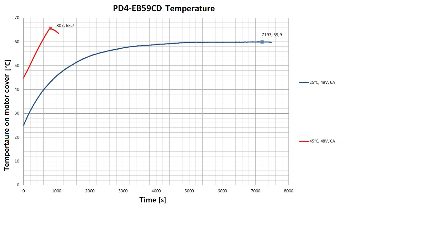 At 45°C (+48 V, 4.2/6 A rms, Velocity Mode 30 rpm), temperature protection switched off the controller after approx. 21 (stepper motor) or 14 (BLDC motor) minutes.