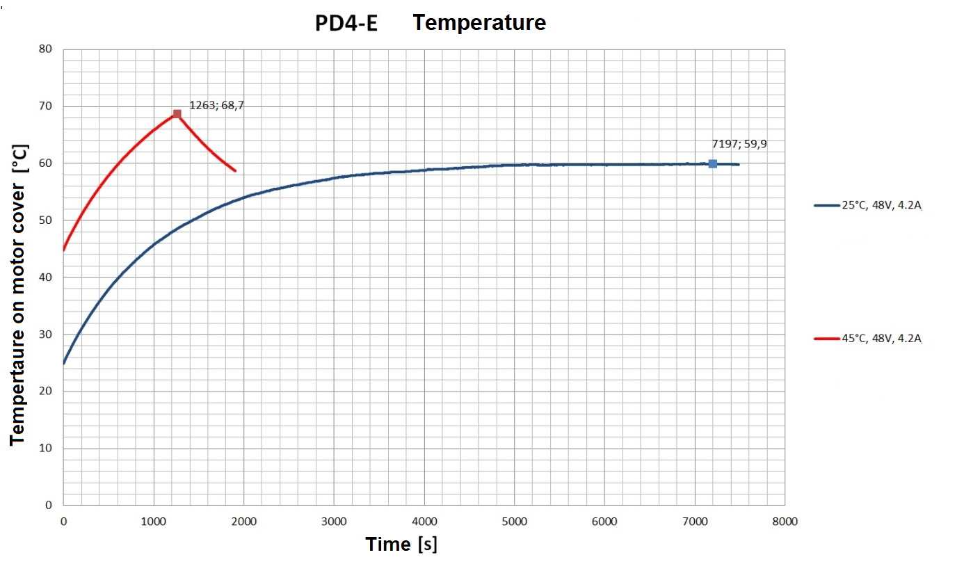 在 45°C(+48 V,4.2/6 A rms,速度模式 30 rpm)时,温度保护在约 21 分钟(步进电机)或 14 分钟(直流无刷电机)后关闭控制器。