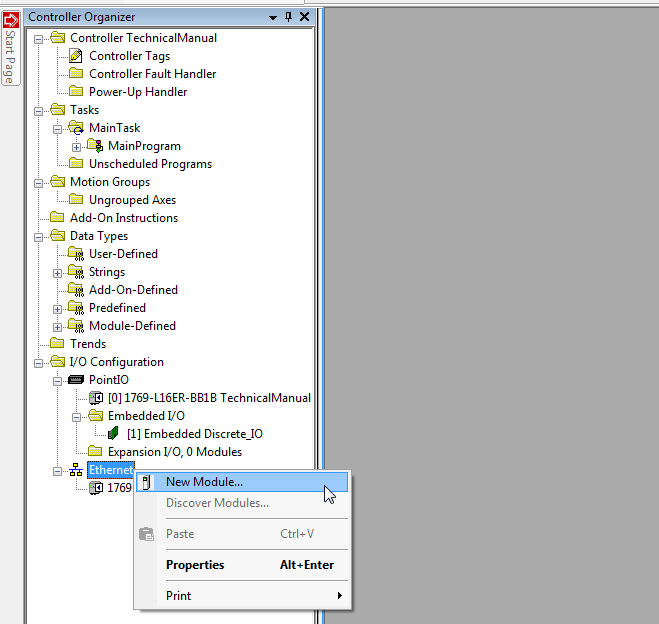Commissioning EtherNet/IP™ This controller is equipped with an EtherNet/IP™ interface. Read chapter EtherNet/IPfor further details. Note: Nanotec controllers are always based on CANopen standard CiA402. All attributes are therefore stored in a so-called object dictionary. These can be addressed with an index and a subindex, e.g., 1018h:01h. The index is a 16-bit value and the subindex is an 8-bit value. The controller offers EtherNet/IP™, but this protocol uses a different procedure: all attributes are stored on the basis of objects. For this reason, the PD6-E uses an assignment to create a bridge between EtherNet/IP™ and CANopen. As a consequence, the configuration of this controller is somewhat different that with normal EtherNet/IP™ devices. The following commissioning procedure assumes the use of a CompactLogix PLC and Studio 5000 software from Rockwell. Connection Connect the logic supply voltage to connector X2 (see chapter X2 — Inputs/outputs and external logic supply). Connect the Rockwell CompactLogix PLC to connection X3 of the controller (see chapter X3 — EtherNet/IP IN). Software connection By default, the controller is in DHCP mode. A DHCP server is therefore needed in the network. If no DHCP server is available or if the controller is to operate with a fixed IP address, the BOOTP/DHCP tool from Rockwell can be used. With this tool, is is possible to either assign an IP address to the controller by means of DHCP or to assign a static address and deactivate DHCP. BOOTP is not supported by the controller. If you have your own DHCP server and wish to ascertain the IP address, this can be accomplished most easily with the ping tool. To do this, the NetBIOS service must be activated on the PC and the MAC address of the controller must be known. Example If controller with MAC address 44:AA:E8:00:02:9F is to be addressed, the tool is called in a shell or command line using:ping MAC-44AAE800029F You must perform the next steps in the Rockwell Logix Designer: Use the RSLinx Classic software to create an EtherNet/IP™ driver. Refer to the corresponding manual for help. Select the project path of the PLC. Import the EDS file of the controller: Click on Tools\EDS Hardware Installation Tool, select Register an EDS file(s). Then select the correct EDS file and import it. Right-click on Ethernet in the Controller Organizer and select New Module…. Select the Catalog tab, find entry PD6-E and select the device with which you would like to work. The New Module input mask then opens. Select the General tab and enter a name and the IP address for the device. Use of the Host Name is not supported. Click on Change to select one of the assemblies (either IIO Common or I/O PDI, see chapter Assembly objects). Select the Connection tab and enter an RPI value for the I/O Common data as shown in the following figure. The input type can also be changed to unicast or multicast. Lastly, close the mask by clicking on OK.