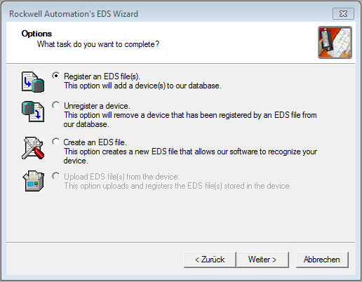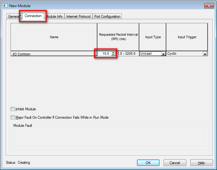 Software connection By default, the controller is in DHCP mode. A DHCP server is therefore needed in the network. If no DHCP server is available or if the controller is to operate with a fixed IP address, the BOOTP/DHCP tool from Rockwell can be used. With this tool, is is possible to either assign an IP address to the controller by means of DHCP or to assign a static address and deactivate DHCP. BOOTP is not supported by the controller. If you have your own DHCP server and wish to ascertain the IP address, this can be accomplished most easily with the ping tool. To do this, the NetBIOS service must be activated on the PC and the MAC address of the controller must be known. Example If controller with MAC address 44:AA:E8:00:02:9F is to be addressed, the tool is called in a shell or command line using:ping MAC-44AAE800029F You must perform the next steps in the Rockwell Logix Designer: Use the RSLinx Classic software to create an EtherNet/IP™ driver. Refer to the corresponding manual for help. Select the project path of the PLC. Import the EDS file of the controller: Click on Tools\EDS Hardware Installation Tool, select Register an EDS file(s). Then select the correct EDS file and import it. Right-click on Ethernet in the Controller Organizer and select New Module…. Select the Catalog tab, find entry PD6-E and select the device with which you would like to work. The New Module input mask then opens. Select the General tab and enter a name and the IP address for the device. Use of the Host Name is not supported. Click on Change to select one of the assemblies (either IIO Common or I/O PDI, see chapter Assembly objects). Select the Connection tab and enter an RPI value for the I/O Common data as shown in the following figure. The input type can also be changed to unicast or multicast. Lastly, close the mask by clicking on OK.